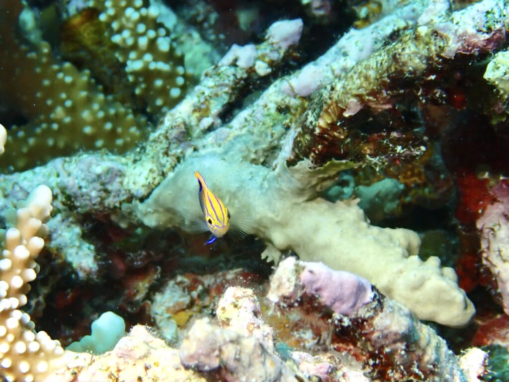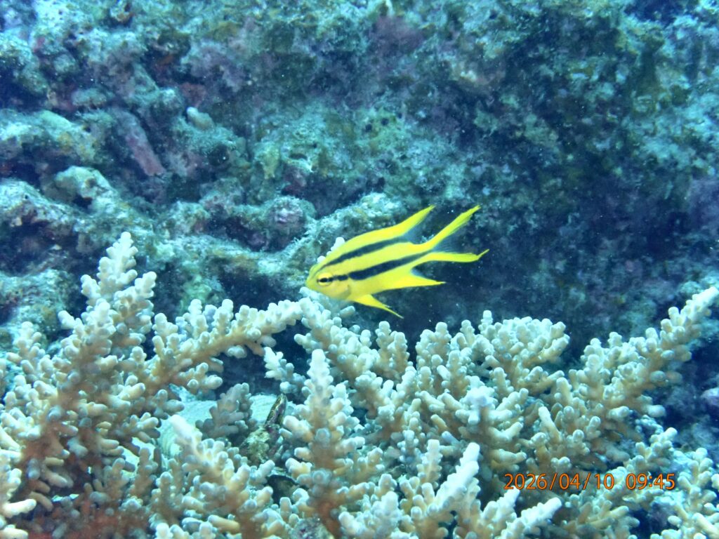 虎柄のヒレナガスズメダイの幼魚。小さい時はカメラを向けてもらえます。