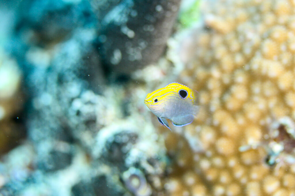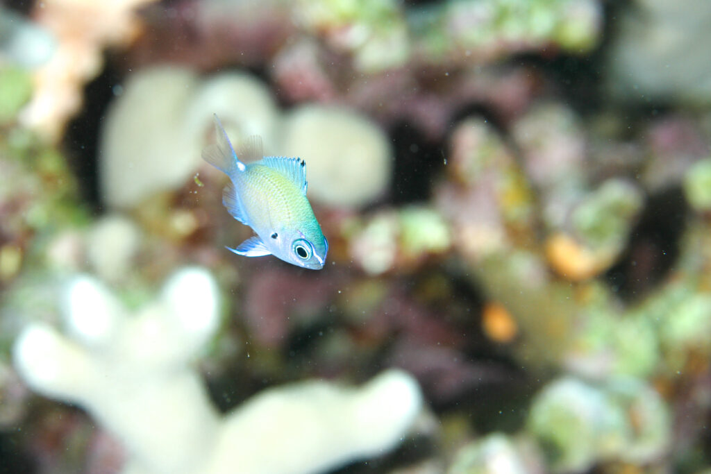 みかぴー様 ヒレグロスズメダイ こちらも小さい、猫目なのが可愛いポイントよね